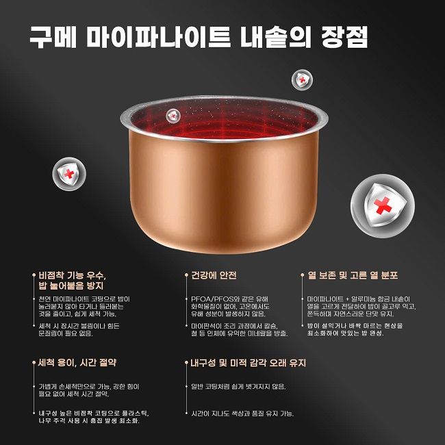 구미 코리아의 독점 마이판석(맥반석) 코팅 내솥과 함께 가족의 건강을 지키며 완벽한 밥맛을 경험해 보세요.천연 마이판석 코팅은 밥이 눌어붙거나 타는 것을 방지할 뿐만 아니라 세척을 훨씬 간편하게 만들어 줍니다.